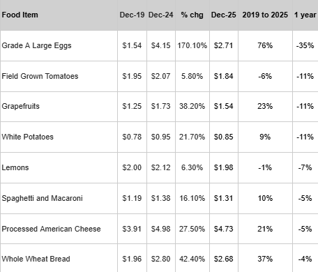 CPI “Average Prices by Product” data highlight the persistence of these pressures. Coffee prices have risen more than 120 percent since 2019 and remain over 30 percent higher than a year ago, transforming a low-salience daily purchase into a recurring budgetary strain. Egg prices, despite falling more than 30 percent over the past year, remain roughly 75 percent above their 2019 level, indicating that volatility has subsided but the price floor has shifted upward. Orange juice prices — particularly frozen concentrate — have more than doubled since 2019 and continue to edge higher year over year, underscoring ongoing supply-side constraints.