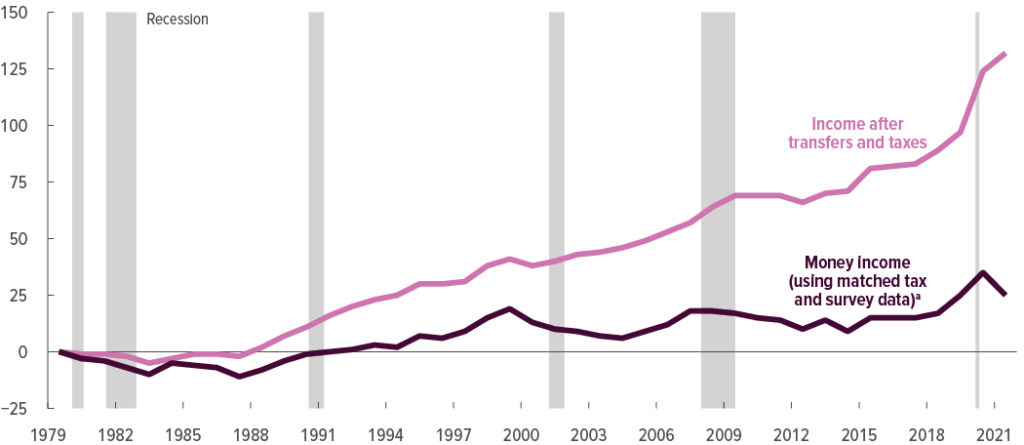 According to January’s Congressional Budget Office (CBO) report, average total income for the poorest households nearly doubled from 1979 to 2022. But most of that increase was fueled by government wealth transfers.